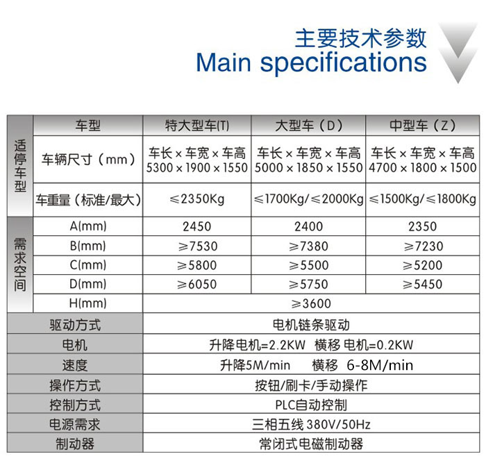二层升降横移 运行原理 该设备的顶层载车板可上下升降;地面层载车板做横移,地面层留有一个空位,可以通过横移载车板变换空位,使空位正上方的载车板下降到地面层。地面层载车板上的汽车可直接出车,完成存取过程
